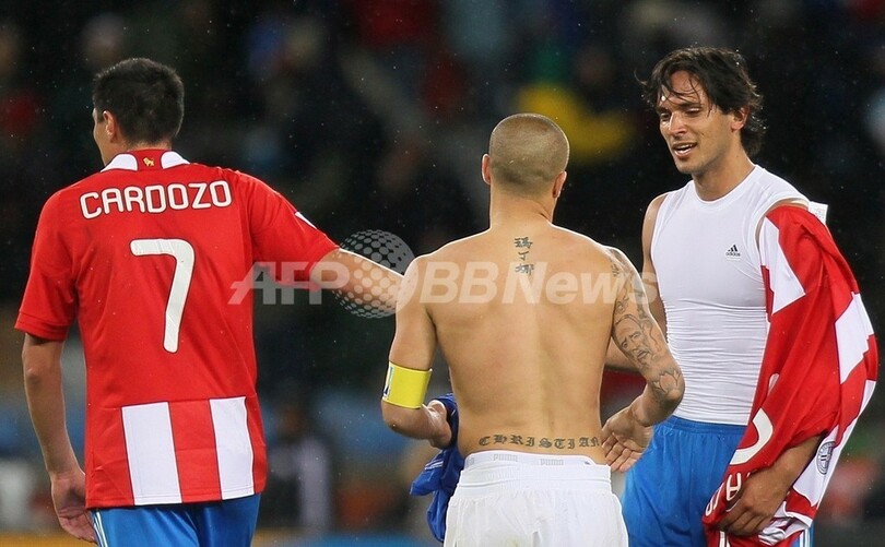 パラグアイは前半39分、アウレリアーノ・トーレス(Aureliano Torres)のフリーキックをアントリン・アルカラス(Antolin Alcaraz)が頭で合わせて先制した。しかし、後半18分にコーナーキックからダニエレ・デ・ロッシ(Daniele De Rossi)が得点し、2006年ドイツ大会の王者イタリアが追いついた。(c)AFP