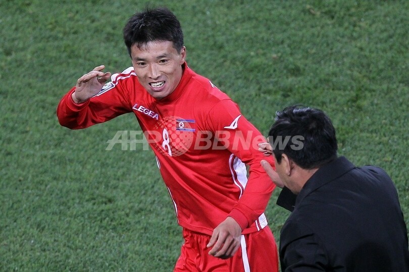 北朝鮮は同44分、鄭大世(Jong Tae-Se、チョン・テセ)のポストプレーからチ・ユンナム(Ji Yun-Nam)が得点を決め、1点を返した。(c)AFP