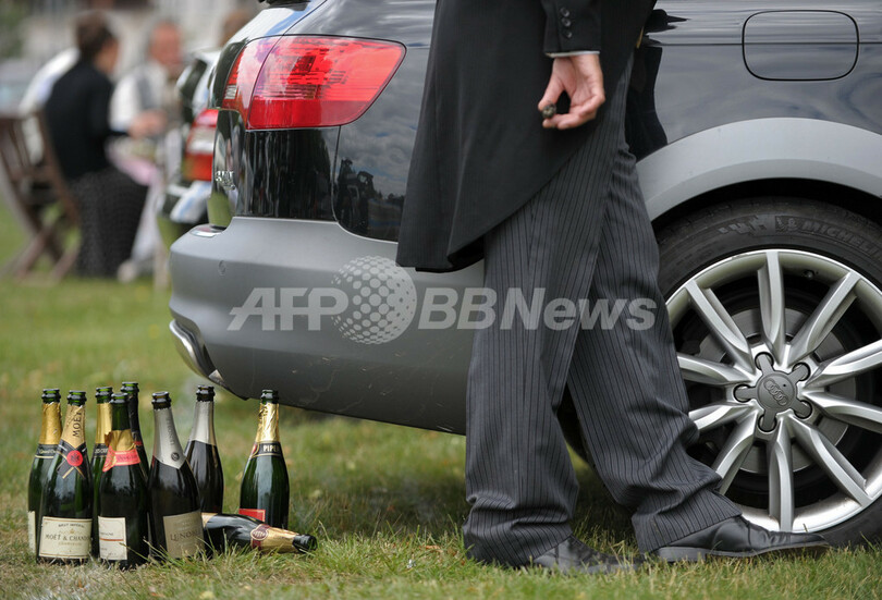 写真は、アスコット競馬場の駐車場で、空になったシャンパンのびん(2010年6月15日撮影)。(c)AFP/ADRIAN DENNIS