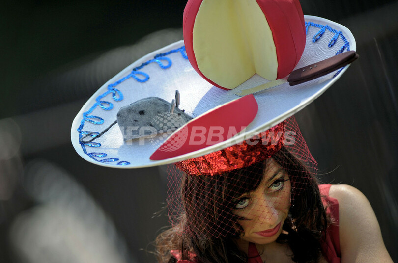 写真は、チーズをテーマにした帽子をかぶって「ロイヤルアスコット」観戦に訪れた人(2010年6月17日撮影)。(c)AFP/ADRIAN DENNIS