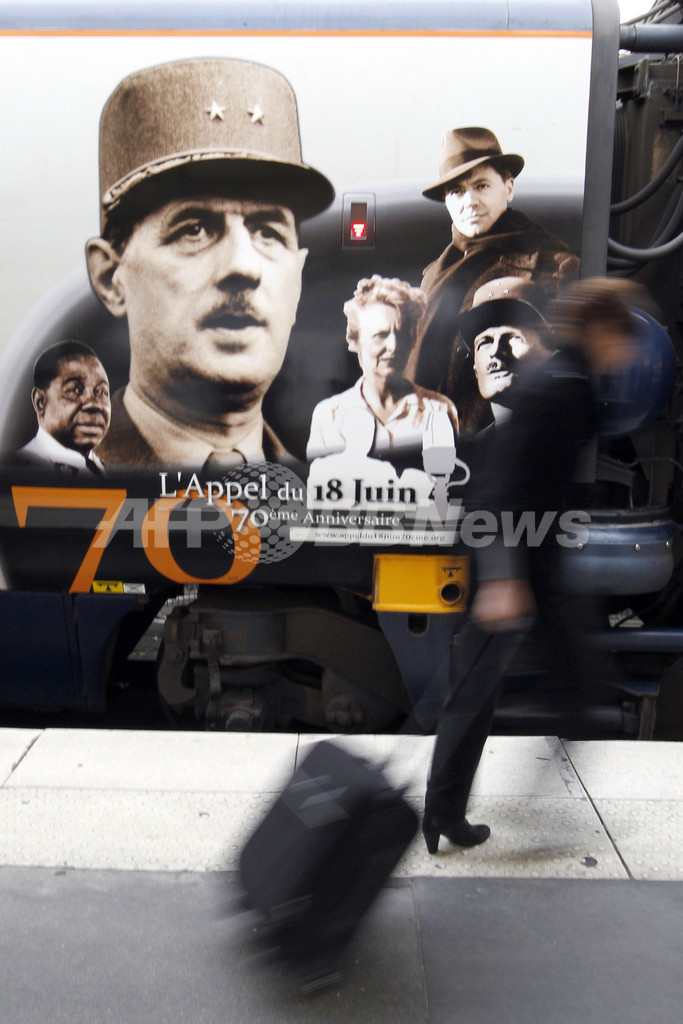 【6月18日 AFP】フランスのシャルル・ド・ゴール(Charles De Gaulle)将軍(のちの初代仏大統領)が1940年6月18日に亡命先のロンドン(London)で亡命政権の樹立を宣言し、ナチス・ドイツへの抵抗を呼びかけてから70年を迎えるのを記念し、英国と欧州大陸を結ぶ高速鉄道ユーロスター(Eurostar)の車体にドゴール将軍や当時の著名人の写真が張られている。