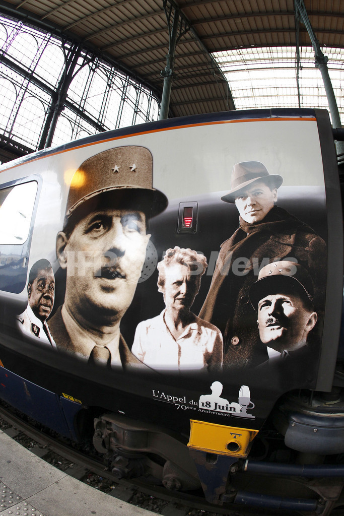 【6月18日 AFP】フランスのシャルル・ド・ゴール(Charles De Gaulle)将軍(のちの初代仏大統領)が1940年6月18日に亡命先のロンドン(London)で亡命政権の樹立を宣言し、ナチス・ドイツへの抵抗を呼びかけてから70年を迎えるのを記念し、英国と欧州大陸を結ぶ高速鉄道ユーロスター(Eurostar)の車体にドゴール将軍や当時の著名人の写真が張られている。