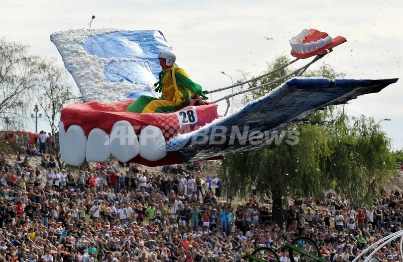 ニュース ライフ こぼれ話 ドラゴンや入れ歯、トウモロコシが空を飛ぶ!鳥人間コンテスト 2010年6月21日 18:57 発信地:キエフ/ウクライナ [ ロシア・CIS ウクライナ ] このニュースをシェア ‹ › ❮ 1/11 ❯ ウクライナの首都キエフ(Kiev)で19日、オーストリアの健康飲料メーカー、レッドブル(Red Bull)が主催する人力飛行機コンテスト「フルークターク(Flugtag、ドイツ語で「飛行の日」)」が開催され、39チームが持ち寄った自慢の自作飛行機で大空に挑んだ。写真は、自作の人力飛行機で空に飛び出す「Caries」チームのメンバー(2010年6月19日撮影)。(c)AFP/SERGEI SUPINSKY 画像作成中 ! 【6月21日 AFP】ウクライナの首都キエフ(Kiev)で19日、オーストリアの健康飲料メーカー、レッドブル(Red Bull)が主催する人力飛行機コンテストコンテスト「フルークターク(Flugtag、ドイツ語で「飛行の日」)」が開催され、39チームが持ち寄った自慢の自作飛行機で大空に挑んだ。(c)AFP ライフ 一覧へ> メディア・報道関係・法人の方向け 写真・動画 購入のお問合せ>