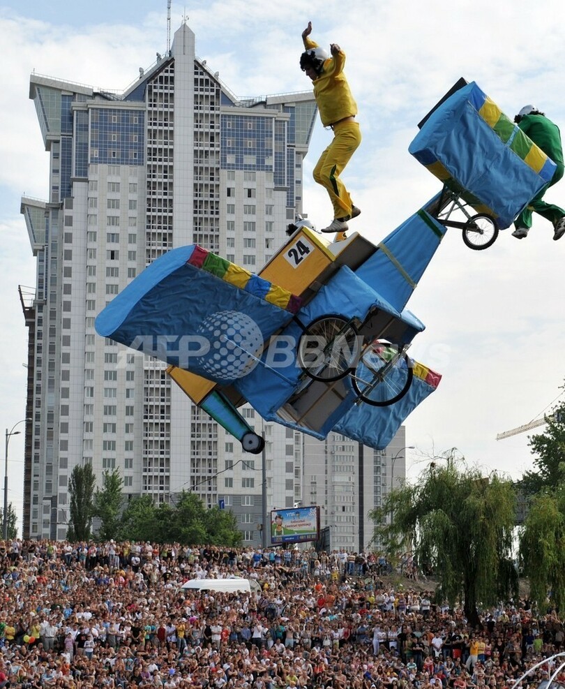 ニュース ライフ こぼれ話 ドラゴンや入れ歯、トウモロコシが空を飛ぶ!鳥人間コンテスト 2010年6月21日 18:57 発信地:キエフ/ウクライナ [ ロシア・CIS ウクライナ ] このニュースをシェア ‹ › ❮ 4/11 ❯ ウクライナの首都キエフ(Kiev)で19日、オーストリアの健康飲料メーカー、レッドブル(Red Bull)が主催する人力飛行機コンテスト「フルークターク(Flugtag、ドイツ語で「飛行の日」)」が開催され、39チームが持ち寄った自慢の自作飛行機で大空に挑んだ。写真は、自作の人力飛行機で空に飛び出す「Svema-2010」チームのメンバー(2010年6月19日撮影)。(c)AFP/SERGEI SUPINSKY 画像作成中 ! 【6月21日 AFP】ウクライナの首都キエフ(Kiev)で19日、オーストリアの健康飲料メーカー、レッドブル(Red Bull)が主催する人力飛行機コンテストコンテスト「フルークターク(Flugtag、ドイツ語で「飛行の日」)」が開催され、39チームが持ち寄った自慢の自作飛行機で大空に挑んだ。(c)AFP ライフ 一覧へ> メディア・報道関係・法人の方向け 写真・動画 購入のお問合せ>