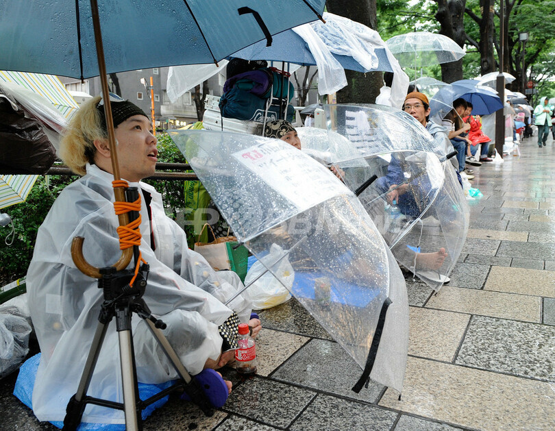 【6月23日 AFP】米アップル(Apple)の携帯電話端末iPhone(アイフォーン)の最新モデル「iPhone4」の発売を翌日に控えた23日、都内のソフトバンクモバイル(Softbank Mobile)の主力店舗前では雨にもかかわらず徹夜で並ぼうという数十人が列を作った。時差の関係で、日本では世界で最も早くiPhone4が発売される。