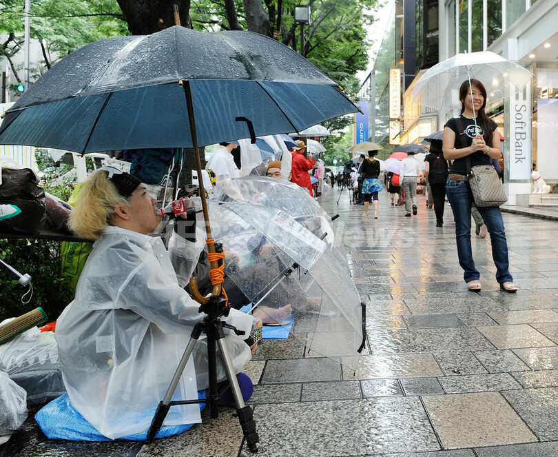 【6月23日 AFP】米アップル(Apple)の携帯電話端末iPhone(アイフォーン)の最新モデル「iPhone4」の発売を翌日に控えた23日、都内のソフトバンクモバイル(Softbank Mobile)の主力店舗前では雨にもかかわらず徹夜で並ぼうという数十人が列を作った。時差の関係で、日本では世界で最も早くiPhone4が発売される。