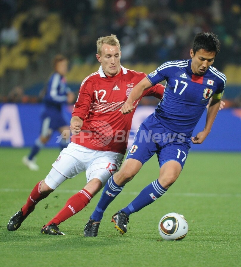 【6月25日 AFP】(記事更新、写真追加)2010年サッカーW杯南アフリカ大会(2010 World Cup)1次リーグE組、デンマーク対日本。日本は3-1で勝利し、勝ち点6(2勝1敗)の同組2位で決勝トーナメントに進んだ。日本の決勝トーナメント進出は、自国開催以外のW杯では初めて。