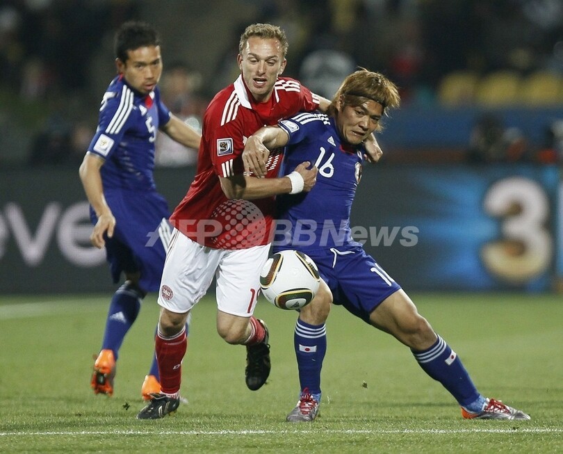 【6月25日 AFP】(記事更新、写真追加)2010年サッカーW杯南アフリカ大会(2010 World Cup)1次リーグE組、デンマーク対日本。日本は3-1で勝利し、勝ち点6(2勝1敗)の同組2位で決勝トーナメントに進んだ。日本の決勝トーナメント進出は、自国開催以外のW杯では初めて。