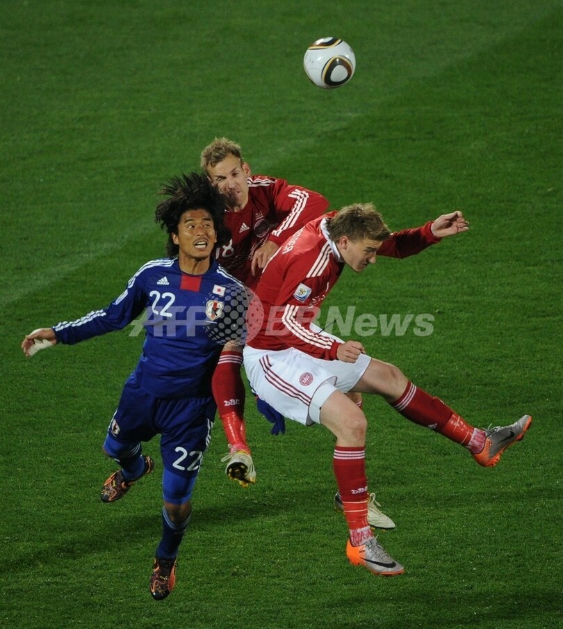 【6月25日 AFP】(記事更新、写真追加)2010年サッカーW杯南アフリカ大会(2010 World Cup)1次リーグE組、デンマーク対日本。日本は3-1で勝利し、勝ち点6(2勝1敗)の同組2位で決勝トーナメントに進んだ。日本の決勝トーナメント進出は、自国開催以外のW杯では初めて。