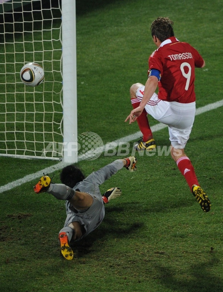 【6月25日 AFP】(記事更新、写真追加)2010年サッカーW杯南アフリカ大会(2010 World Cup)1次リーグE組、デンマーク対日本。日本は3-1で勝利し、勝ち点6(2勝1敗)の同組2位で決勝トーナメントに進んだ。日本の決勝トーナメント進出は、自国開催以外のW杯では初めて。