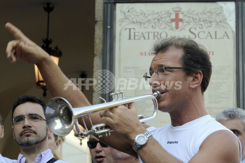 【6月25日 AFP】イタリア・ミラノ(Milan)にある国際的に著名なオペラ劇場、スカラ座(La Scala)前で24日、劇場の出演者らが私服で演奏し、イタリア政府が予算削減を掲げている国立オペラ劇場の改革案に抗議した。