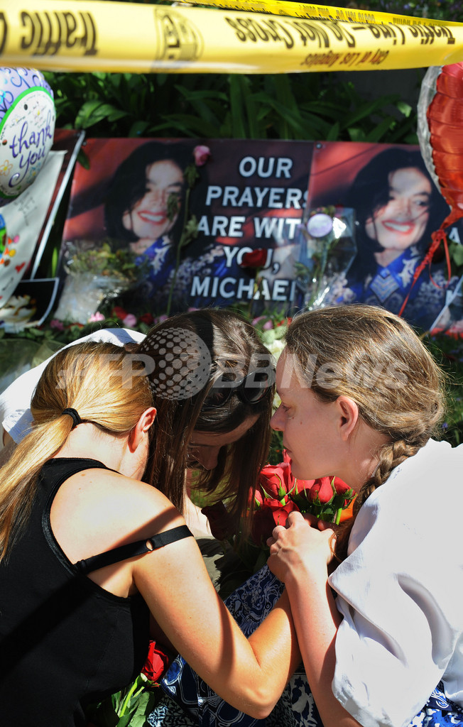 写真は、米ロサンゼルス(Los Angeles)でマイケルさんが最後に住んでいた邸宅ホーンビーヒルズ(Holmby Hills)前で追悼するファン(2009年6月29日撮影)。(c)AFP/Mark RALSTON
