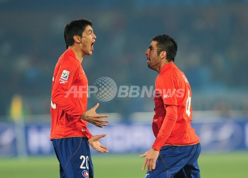 チリは2点を失った直後にマルコ・エストラーダ(Marco Estrada)が2枚目のイエローカードで退場し、10人となったが、後半2分にロドリゴ・ミジャール(Rodrigo Millar)の得点で1点を返した。(c)AFP