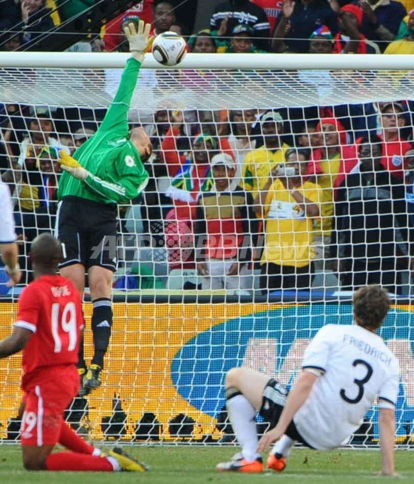 写真は、ランパードのシュートを阻もうとするドイツ代表ゴールキーパーのマヌエル・ノイアー(Manuel Neuer、2010年6月27日撮影)。(c)AFP/CHRISTOPHE SIMON