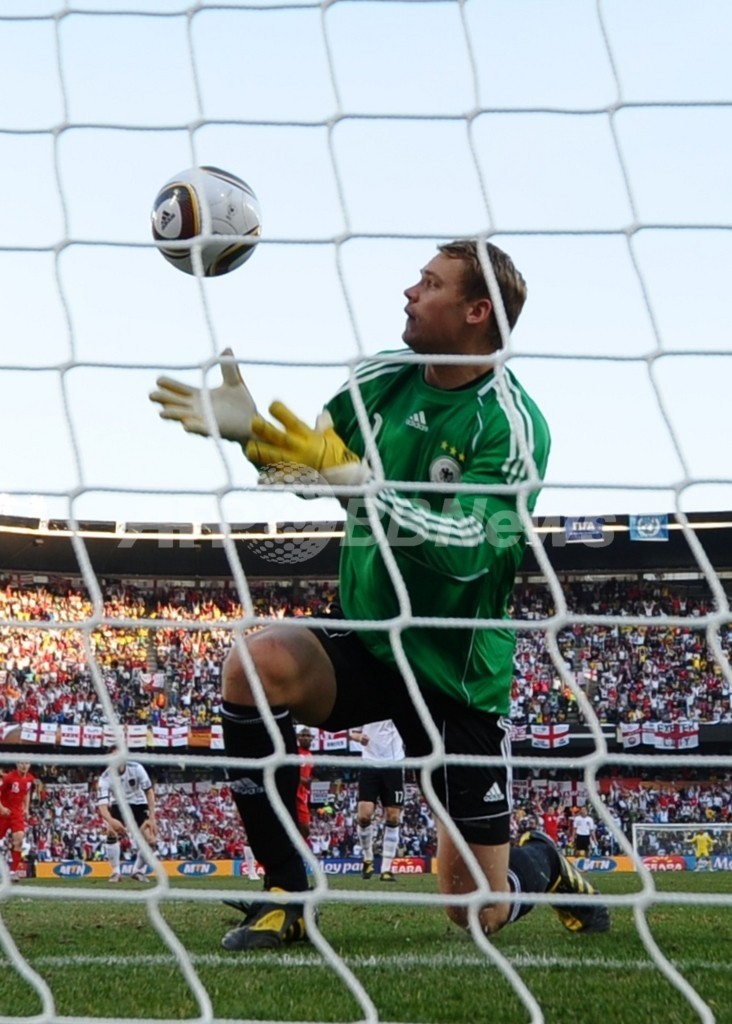 写真は、一旦ゴールラインを越えたランパードのシュートを押さえようとするドイツ代表ゴールキーパーのマヌエル・ノイアー(Manuel Neuer、2010年6月27日撮影)。(c)AFP/JEWEL SAMAD