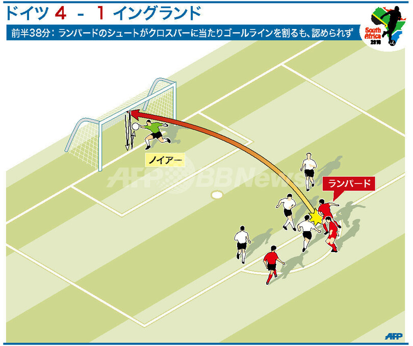 【6月28日 AFP】図は、27日に行われたサッカーW杯南アフリカ大会(2010 World Cup)決勝トーナメント1回戦、ドイツ対イングランド、前半38分にイングランドのランパードが放ったシュートについて示したもの。(c)AFP