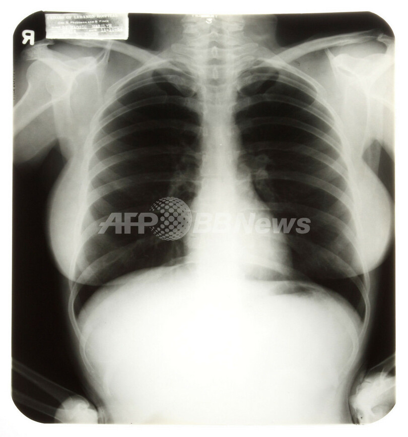 米ラスベガス(Las Vegas)で前週、米エンターテインメント界のレジェンドたちにまつわる品を集めたオークションが行われ、マリリン・モンロー(Marilyn Monroe)やジミ・ヘンドリックス(Jimi Hendrix)などのゆかりの品々が出品された。写真は、4万5000ドル(約400万円)で落札されたマリリン・モンローの胸部のX線写真3枚のうちの1枚。1954年に撮られたもの。(2010年6月28日提供)(c)AFP/JULIEN'S AUCTIONS