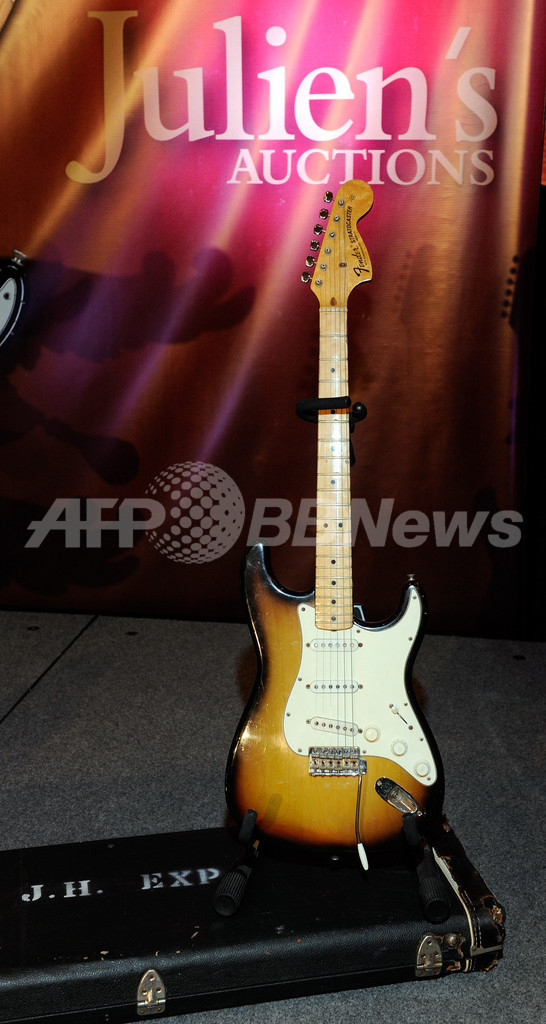米ラスベガス(Las Vegas)で前週、米エンターテインメント界のレジェンドたちにまつわる品を集めたオークションが行われ、マリリン・モンロー(Marilyn Monroe)やジミ・ヘンドリックス(Jimi Hendrix)などのゆかりの品々が出品された。写真は、18万ドル(約1600万円)で落札されたジミ・ヘンドリックスが所有していたフェンダー・ストラトキャスター(Fender Stratocaster)のギター(2010年6月24日撮影)。(c)AFP/Getty Images/Ethan Miller
