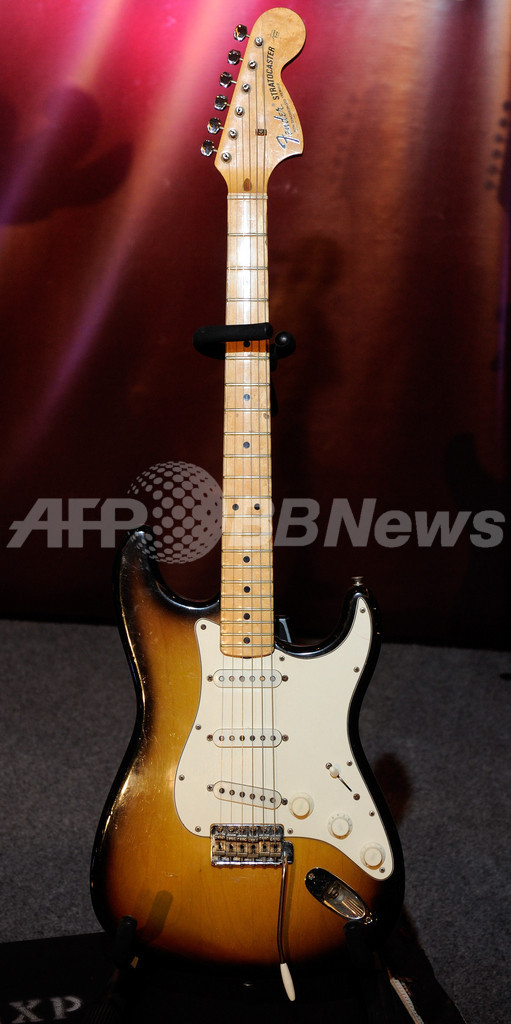 米ラスベガス(Las Vegas)で前週、米エンターテインメント界のレジェンドたちにまつわる品を集めたオークションが行われ、マリリン・モンロー(Marilyn Monroe)やジミ・ヘンドリックス(Jimi Hendrix)などのゆかりの品々が出品された。写真は、18万ドル(約1600万円)で落札されたジミ・ヘンドリックスが所有していたフェンダー・ストラトキャスター(Fender Stratocaster)のギター(2010年6月24日撮影)。(c)AFP/Getty Images/Ethan Miller
