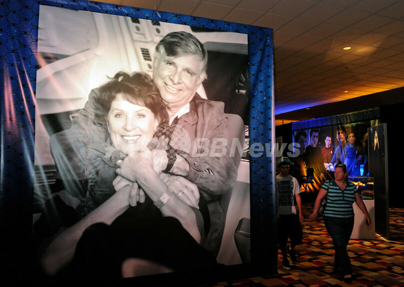 米ラスベガス(Las Vegas)で前週、米エンターテインメント界のレジェンドたちにまつわる品を集めたオークションが行われ、マリリン・モンロー(Marilyn Monroe)やジミ・ヘンドリックス(Jimi Hendrix)などのゆかりの品々が出品された。写真は、「スター・トレック(Star Trek)」の原作者ジーン・ロッデンベリー(Gene Roddenberry)と妻のメイジェル・バレット(Majel Barrett)の写真を印刷したスクリム(2010年6月24日撮影)。(c)AFP/Getty Images/Ethan Miller
