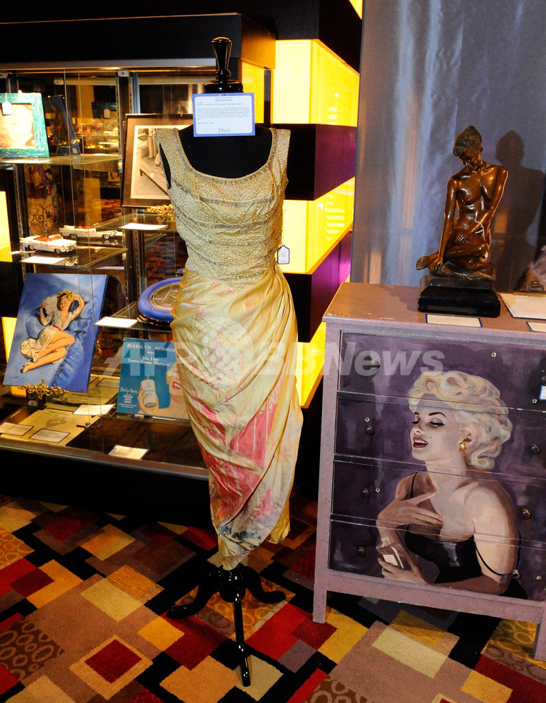 米ラスベガス(Las Vegas)で前週、米エンターテインメント界のレジェンドたちにまつわる品を集めたオークションが行われ、マリリン・モンロー(Marilyn Monroe)やジミ・ヘンドリックス(Jimi Hendrix)などのゆかりの品々が出品された。写真は、マリリン・モンローのドレスとアンナ・ニコル・スミス(Anna Nicole Smith)のドレッサー(2010年6月24日撮影)。(c)AFP/Getty Images/Ethan Miller