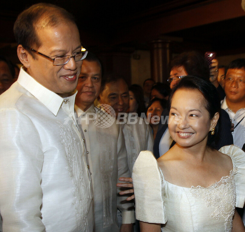 写真は宣誓式を前にマラカニアン宮殿(Malacanang Palace、大統領府)で、グロリア・アロヨ(Gloria Arroyo)前大統領と談笑するベニグノ・アキノ新大統領(2010年6月30日撮影)。(c)AFP