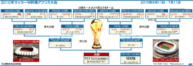 スポーツ サッカー 図解 【図解】サッカーW杯、決勝トーナメント日程 2010年6月30日 18:03 発信地:南アフリカ [ アフリカ 南アフリカ ] このニュースをシェア (c)AFP 【6月30日 AFP】図は、サッカーW杯南アフリカ大会(2010 World Cup)決勝トーナメント進出の16チームと試合日程を示したもの。(c)AFP<ニュース解説画像一覧へ> サッカー 一覧へ> メディア・報道関係・法人の方向け 写真・動画 購入のお問合せ>