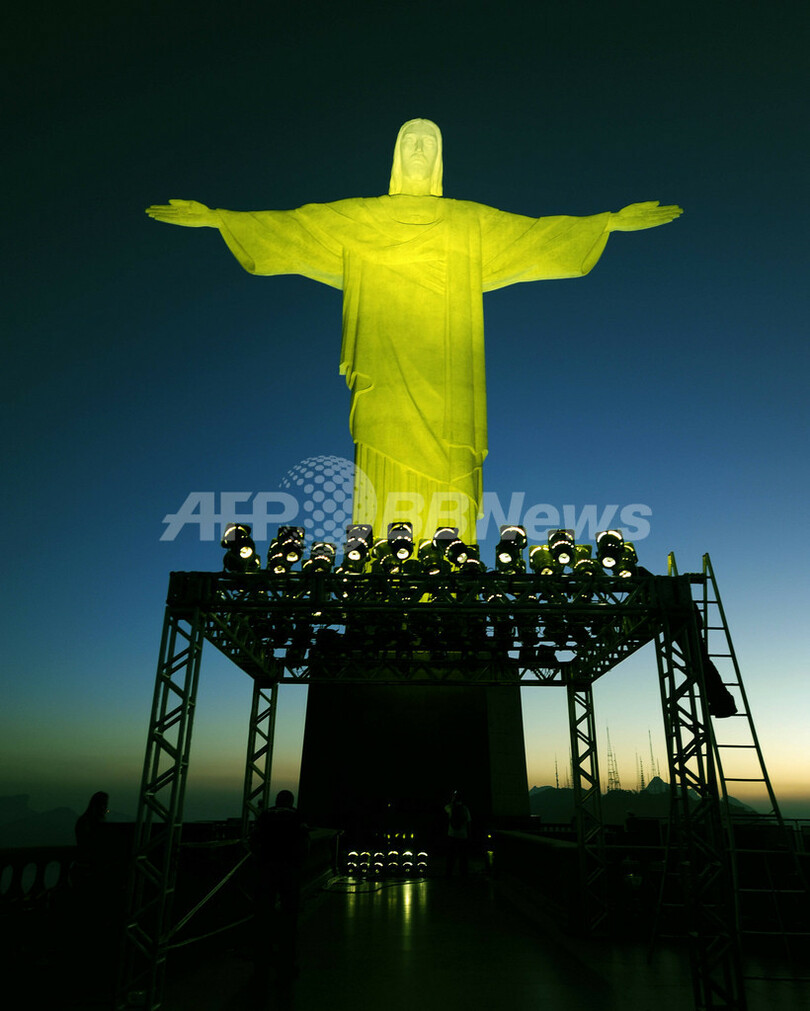 リオのキリスト像が「化粧直し」、W杯中はブラジル色にライトアップ