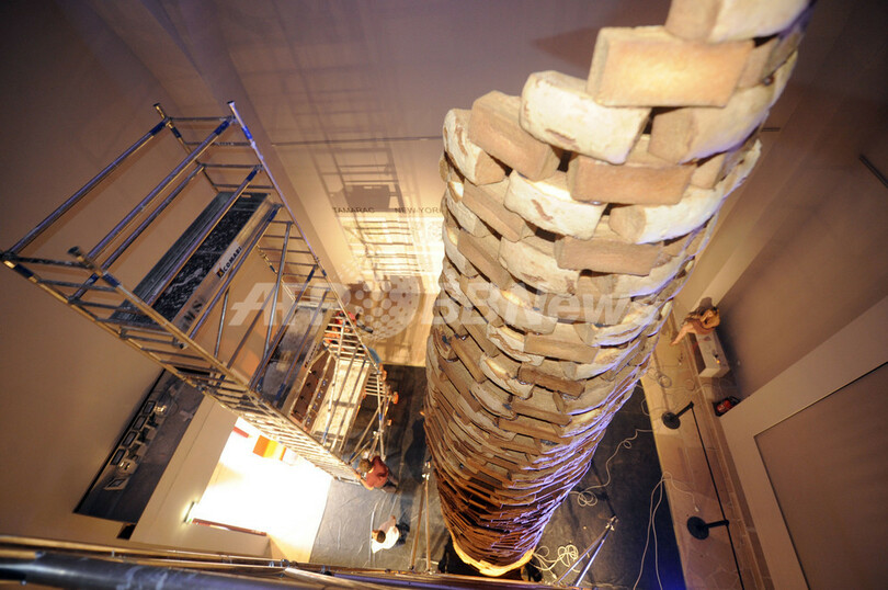 【7月2日 AFP】高さ7.7メートルの巨大ケーキの塔「空腹なき塔(Tower without hunger)」が、パリ(Paris)の建築遺産博物館(Cite de l'Architecture)に設置されている。建築家のジャン・ボカベイユ(Jean Bocabeille)氏とシェフのジル・スタッサール(Gilles Stassart)氏が世界一高さのあるケーキの記録を更新しようと作ったもの。アーモンドとスポンジケーキでできているが、食べることはできない。(c)AFP