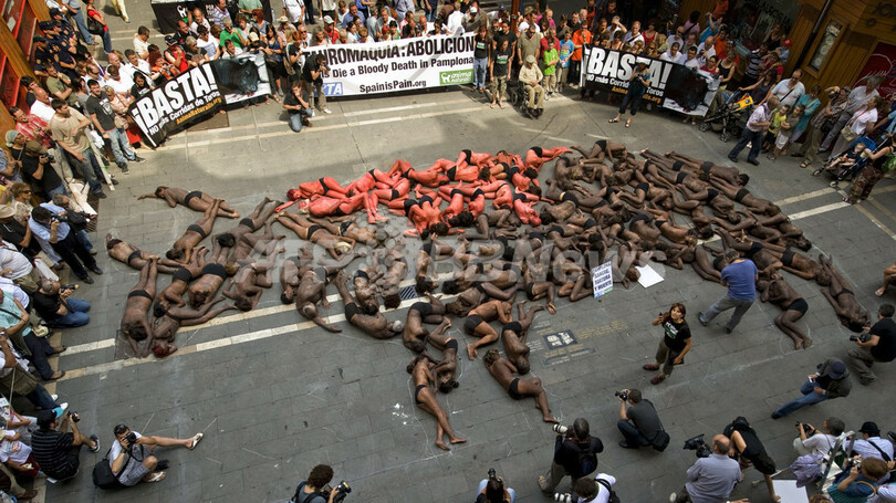 PETA、裸体で闘牛に抗議 スペイン・パンプロナ