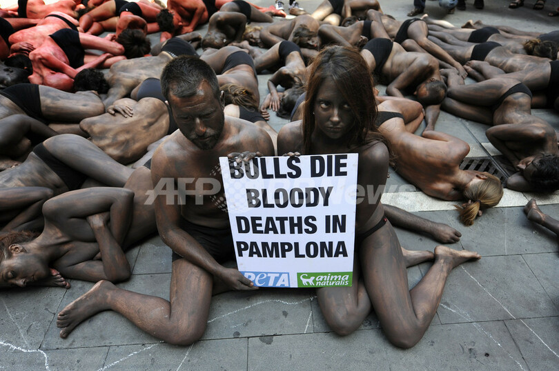 PETA、裸体で闘牛に抗議 スペイン・パンプロナ