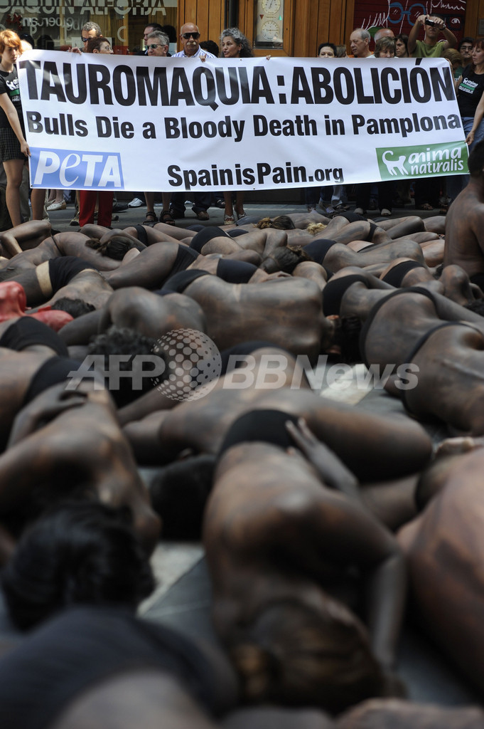 PETA、裸体で闘牛に抗議 スペイン・パンプロナ