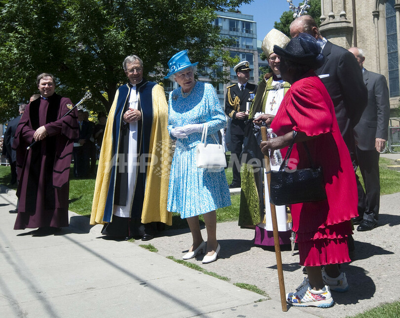 【7月5日 AFP】カナダを訪問中のエリザベス女王(Queen Elizabeth II)が4日、トロント(Toronto)のセント・ジェームズ教会(Cathedral Church of St.James)でミサに出席後、セキュリティーをすり抜けた見知らぬ年配の女性に黒い袋をプレゼントされるという出来事があった。(c)AFP