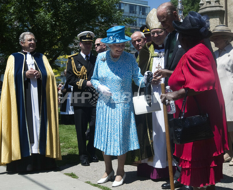【7月5日 AFP】カナダを訪問中のエリザベス女王(Queen Elizabeth II)が4日、トロント(Toronto)のセント・ジェームズ教会(Cathedral Church of St.James)でミサに出席後、セキュリティーをすり抜けた見知らぬ年配の女性に黒い袋をプレゼントされるという出来事があった。(c)AFP