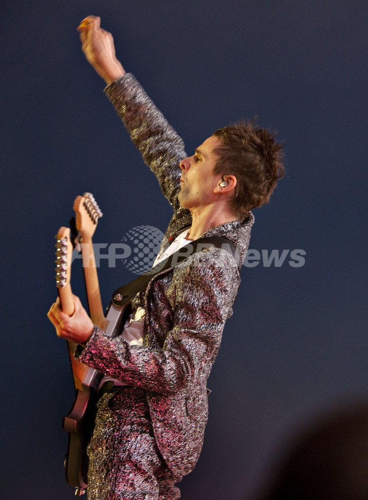 デンマークのロスキレ(Roskilde)で1~4日、野外音楽フェス「ロスキレ・フェスティバル(Roskilde Festival)」が開催され、各国のアーティストが出演し、約7万5000人が来場した。写真は、ステージでパフォーマンスを披露する英バンド、ミューズ(Muse)のマシュー・ベラミー(Matthew Bellamy、2010年7月3日撮影)。(c)AFP/SCANPIX/Torben Christensen