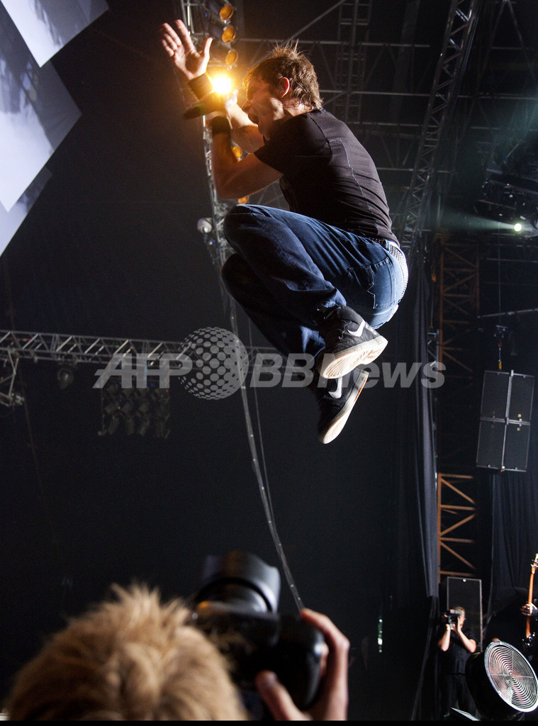 デンマークのロスキレ(Roskilde)で1~4日、野外音楽フェス「ロスキレ・フェスティバル(Roskilde Festival)」が開催され、各国のアーティストが出演し、約7万5000人が来場した。写真は、ステージでパフォーマンスを披露するオーストラリアのバンド、ペンデュラム(Pendulum)のRob Swire(2010年7月3日撮影)。(c)AFP/SCANPIX/Torben Christensen