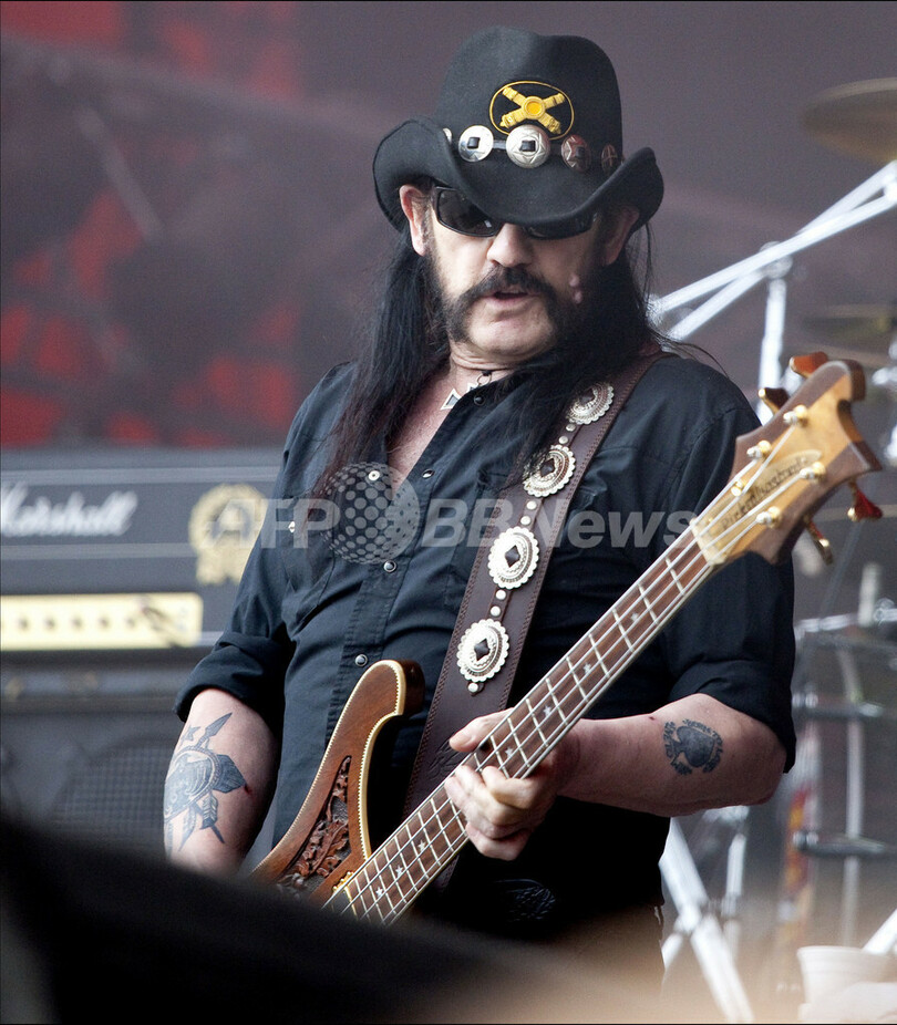 デンマークのロスキレ(Roskilde)で1~4日、野外音楽フェス「ロスキレ・フェスティバル(Roskilde Festival)」が開催され、各国のアーティストが出演し、約7万5000人が来場した。写真は、ステージでパフォーマンスを披露する英バンド、モーターヘッド(Motorhead)のレミー・キルミスター(Lemmy Kilmister、2010年7月4日撮影)。(c)AFP/Anders Birch