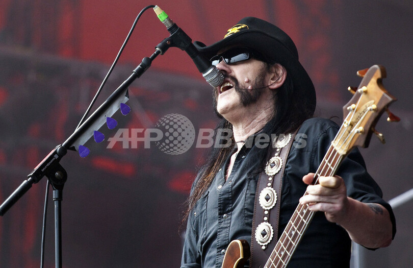 デンマークのロスキレ(Roskilde)で1~4日、野外音楽フェス「ロスキレ・フェスティバル(Roskilde Festival)」が開催され、各国のアーティストが出演し、約7万5000人が来場した。写真は、ステージでパフォーマンスを披露する英バンド、モーターヘッド(Motorhead)のレミー・キルミスター(Lemmy Kilmister、2010年7月4日撮影)。(c)AFP/Anders Birch