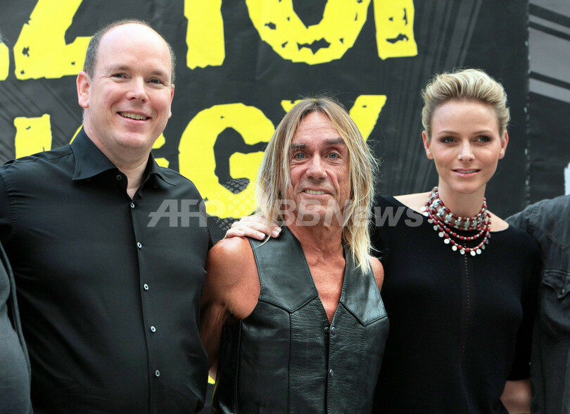 写真は、開演前に写真撮影に臨む(左から)アルベール2世公、イギー・ポップ、ウィットストックさん(2010年7月5日撮影)。(c)AFP/STEPHANE DANNA