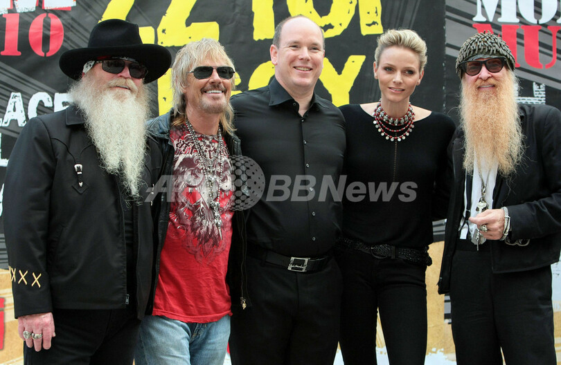 写真は、開演前にZZトップのメンバーらと写真撮影に臨むアルベール2世公とウィットストックさん(中央、2010年7月5日撮影)。(c)AFP/STEPHANE DANNA