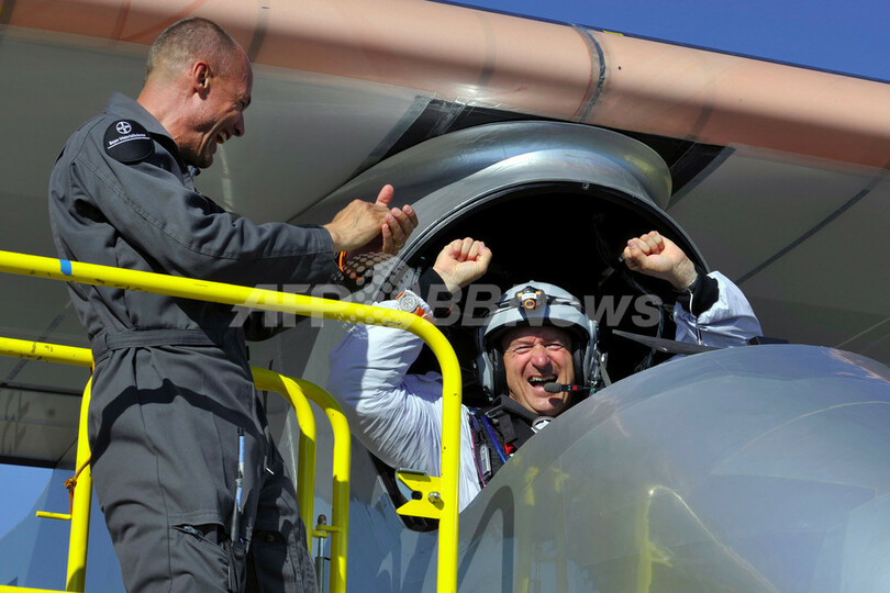 写真は、着陸したソーラー・インパルスの操縦席でガッツポーズするパイロットのAndre Borschbergさん(2010年7月8日撮影)。(c)AFP/DOMINIC FAVRE
