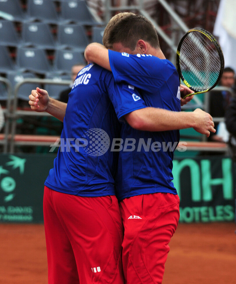 前日のシングルスを2連勝したチェコは、ヤン・ハジェク(Jan Hajek)/ルーカス・ドロウヒー(Lukas Dlouhy)組が7-6、6-3、3-6、6-3でチリのホルヘ・アギラール(Jorge Aguilar)/ニコラス・マシュー(Nicolas Massu)組を下した。(c)AFP