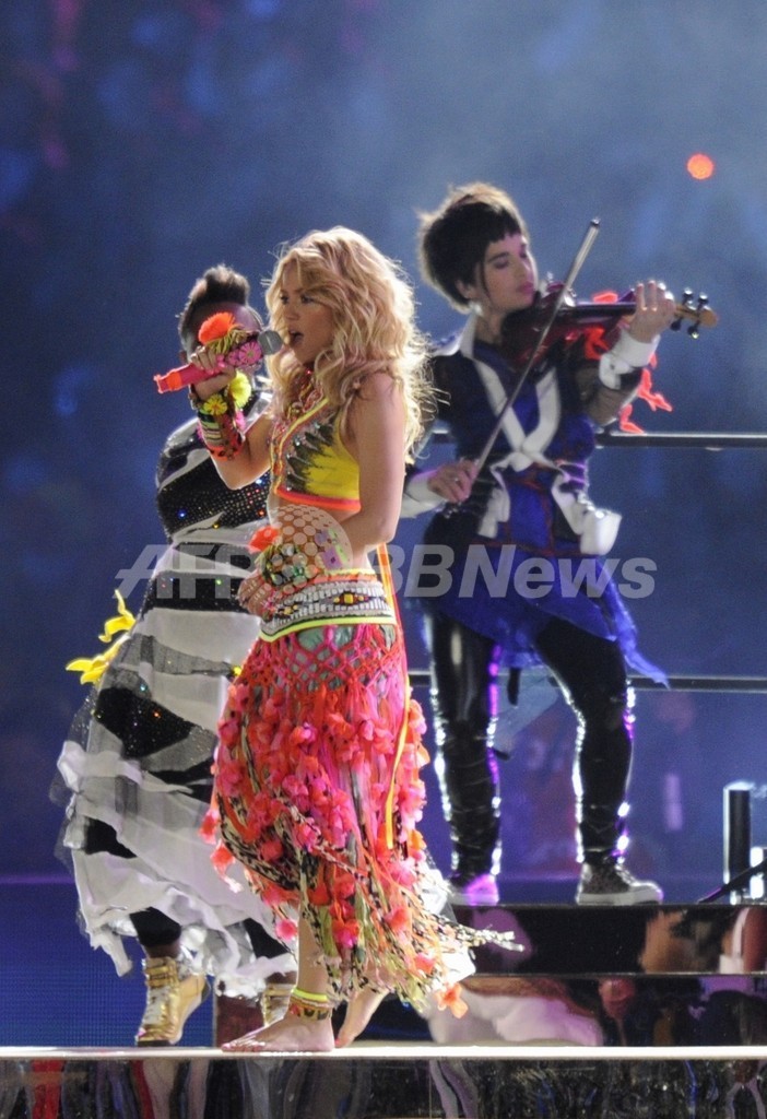 【7月12日 AFP】2010年サッカーW杯南アフリカ大会(2010 World Cup)の閉会式が11日、ヨハネスブルク郊外ソウェト(Soweto)のサッカー・シティ・スタジアム(Soccer City Stadium)で、スペイン対オランダの決勝戦前に行われ、オフィシャルソング「Waka Waka(ワカワカ)」を歌うコロンビア出身の歌手シャキーラ(Shakira)が出演した。(c)AFP
