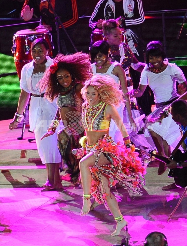 【7月12日 AFP】2010年サッカーW杯南アフリカ大会(2010 World Cup)の閉会式が11日、ヨハネスブルク郊外ソウェト(Soweto)のサッカー・シティ・スタジアム(Soccer City Stadium)で、スペイン対オランダの決勝戦前に行われ、オフィシャルソング「Waka Waka(ワカワカ)」を歌うコロンビア出身の歌手シャキーラ(Shakira)が出演した。(c)AFP