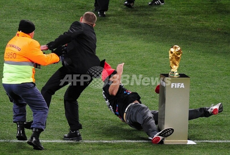 【7月13日 AFP】南アフリカ・ヨハネスブルク(Johannesburg)で11日に行われた2010年サッカーW杯南アフリカ大会(2010 World Cup)決勝、オランダ対スペインの試合直前に、スペイン人の男がピッチに乱入する騒ぎがあった。男はピッチ上に飾られていたW杯優勝トロフィーに向かって突進したが、間一髪で警備員に取り押さえられ、決勝戦は滞りなく行われた。