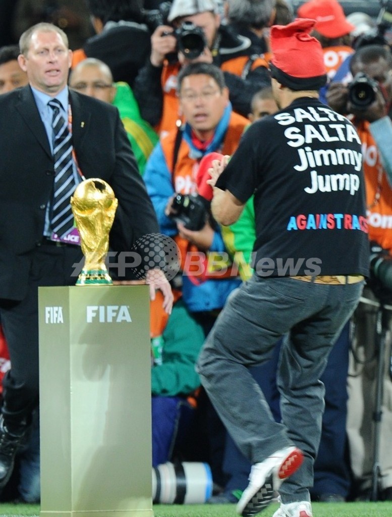 【7月13日 AFP】南アフリカ・ヨハネスブルク(Johannesburg)で11日に行われた2010年サッカーW杯南アフリカ大会(2010 World Cup)決勝、オランダ対スペインの試合直前に、スペイン人の男がピッチに乱入する騒ぎがあった。男はピッチ上に飾られていたW杯優勝トロフィーに向かって突進したが、間一髪で警備員に取り押さえられ、決勝戦は滞りなく行われた。