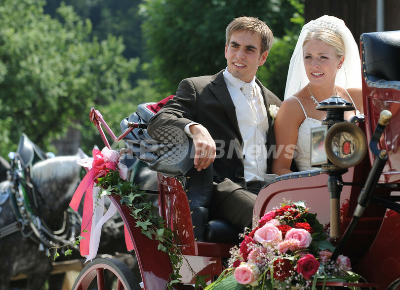 【7月16日 AFP】2010年サッカーW杯南アフリカ大会(2010 World Cup)で3位に入ったドイツ代表のフィリップ・ラーム(Philipp Lahm)が14日、クラウディア(Claudia)さんと同国クラインヘルフェンドルフ(Kleinhelfendorf)の教会で結婚式を挙げた。(c)AFP