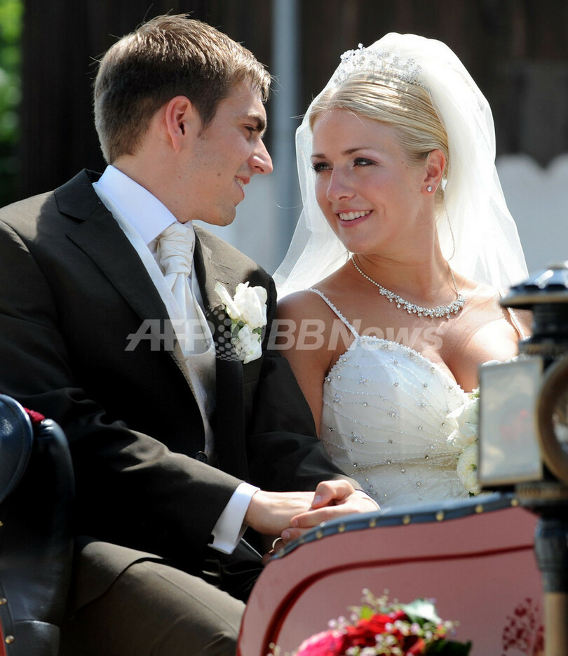 【7月16日 AFP】2010年サッカーW杯南アフリカ大会(2010 World Cup)で3位に入ったドイツ代表のフィリップ・ラーム(Philipp Lahm)が14日、クラウディア(Claudia)さんと同国クラインヘルフェンドルフ(Kleinhelfendorf)の教会で結婚式を挙げた。(c)AFP