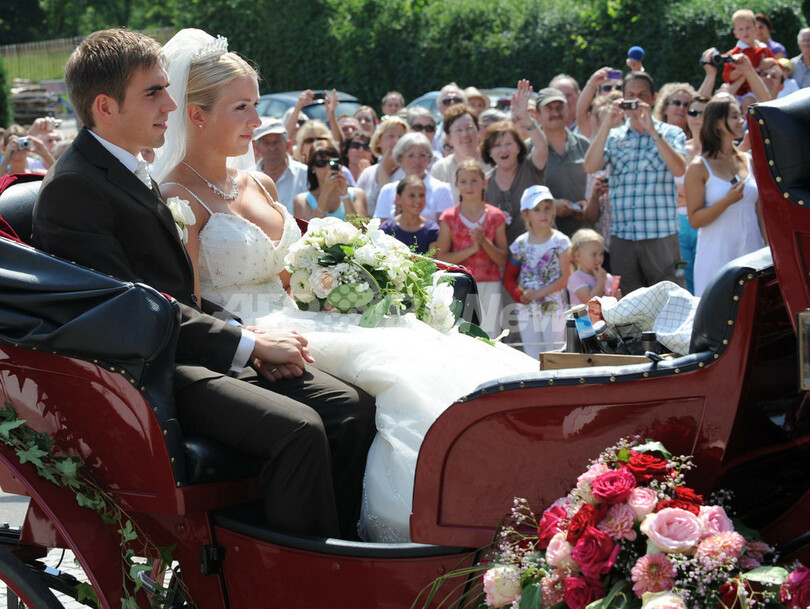 2010年サッカーW杯南アフリカ大会(%%2010 World Cup%%)で3位に入ったドイツ代表のフィリップ・ラーム(%%Philipp Lahm%%)が14日、クラウディア(Claudia)さんと同国クラインヘルフェンドルフ(Kleinhelfendorf)の教会で結婚式を挙げた。写真は挙式を終え、馬車に乗るフィリップ・ラーム(左)とクラウディアさん。(2010年7月14日撮影)(c)AFP/CHRISTOF STACHE