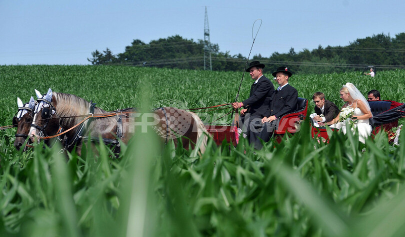 2010年サッカーW杯南アフリカ大会(%%2010 World Cup%%)で3位に入ったドイツ代表のフィリップ・ラーム(%%Philipp Lahm%%)が14日、クラウディア(Claudia)さんと同国クラインヘルフェンドルフ(Kleinhelfendorf)の教会で結婚式を挙げた。写真は挙式を終え、馬車に乗るフィリップ・ラームとクラウディアさん。(2010年7月14日撮影)(c)AFP/ANDREAS GEBERT